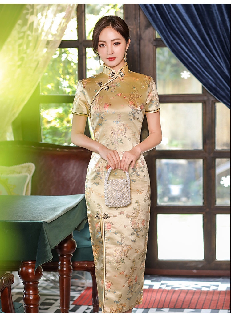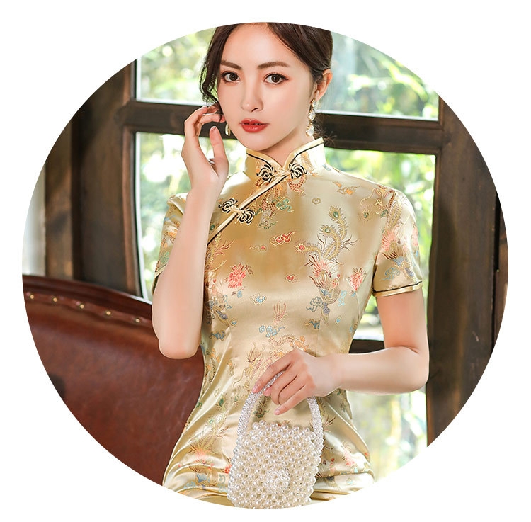 CQ816-2 Gold Satin Cheongsam Dress