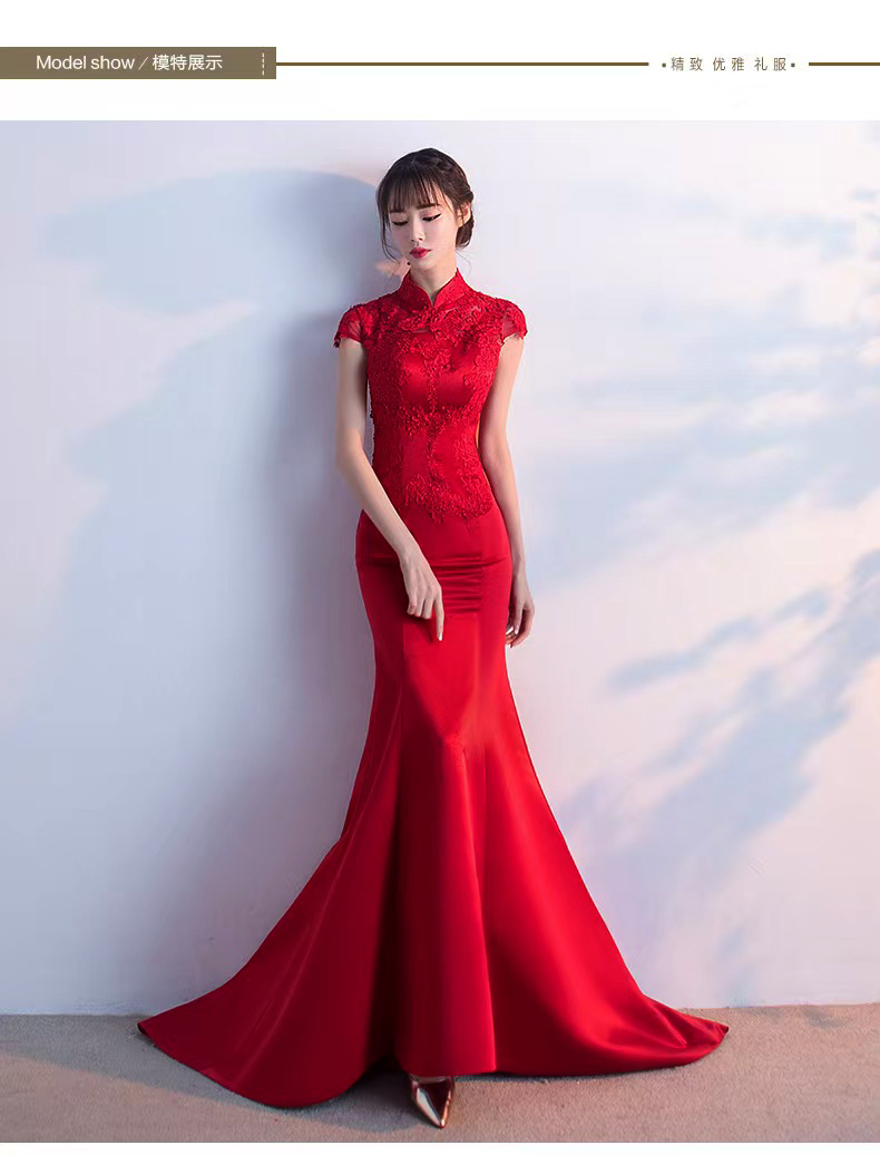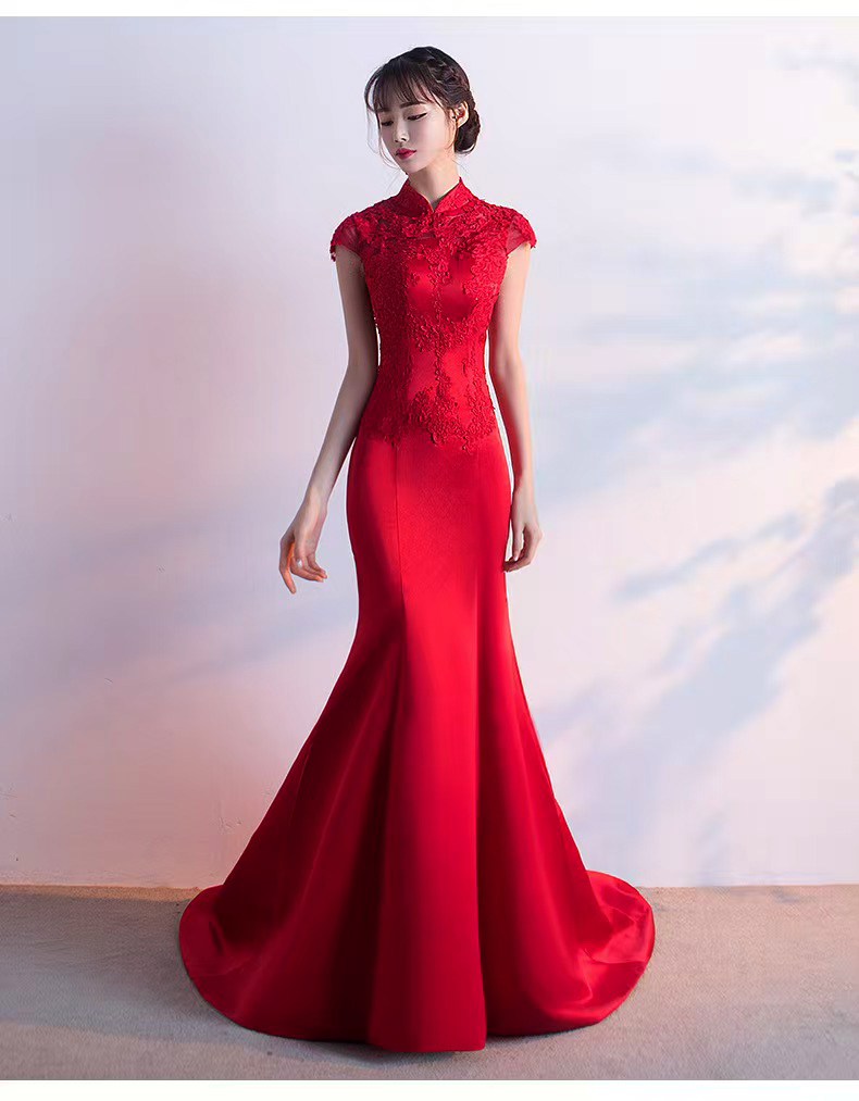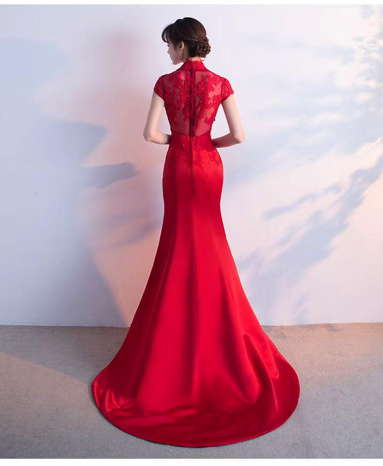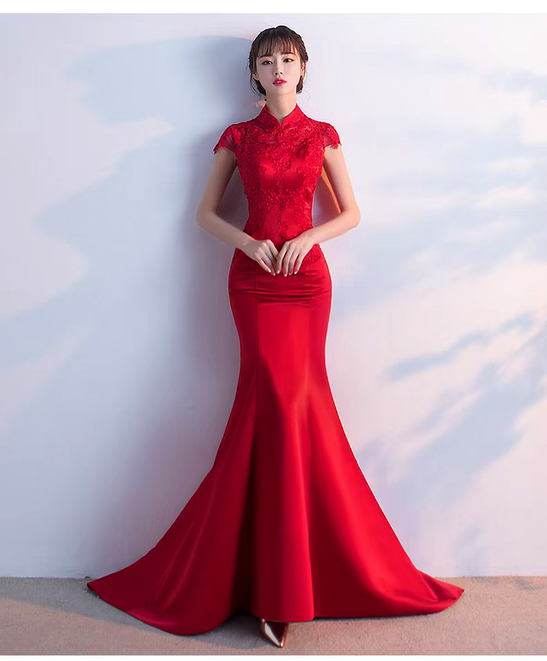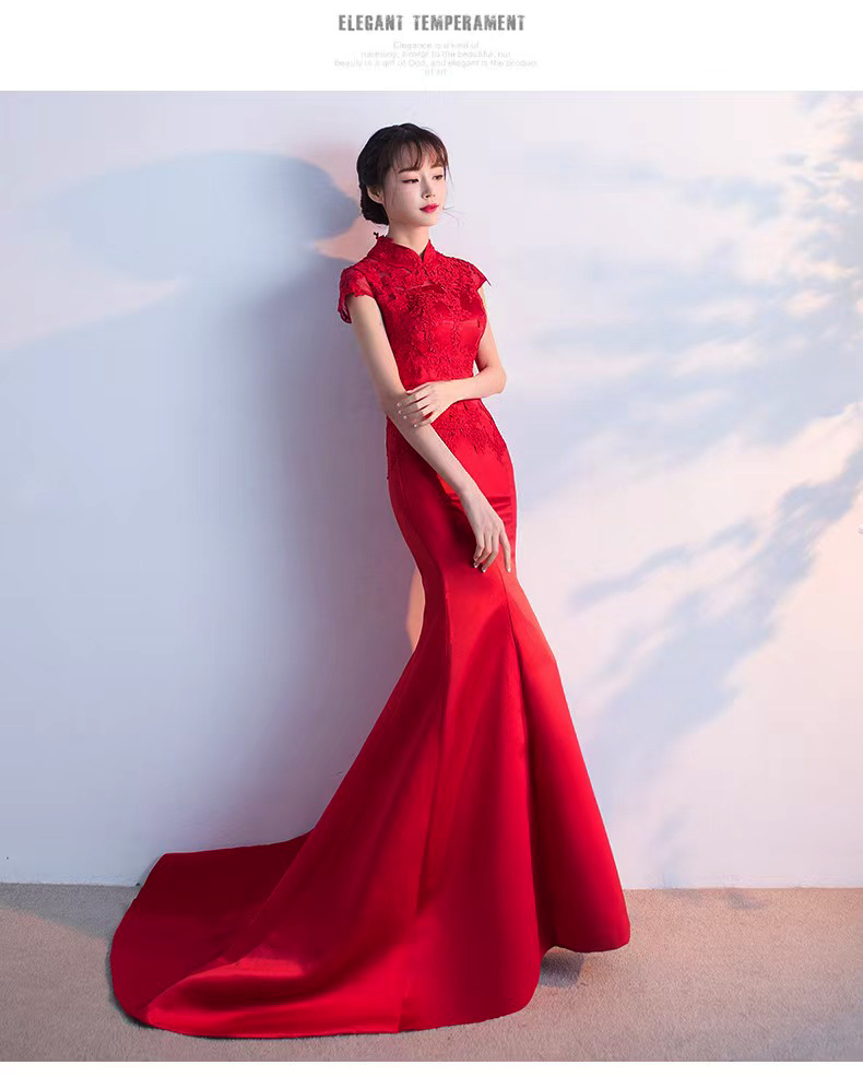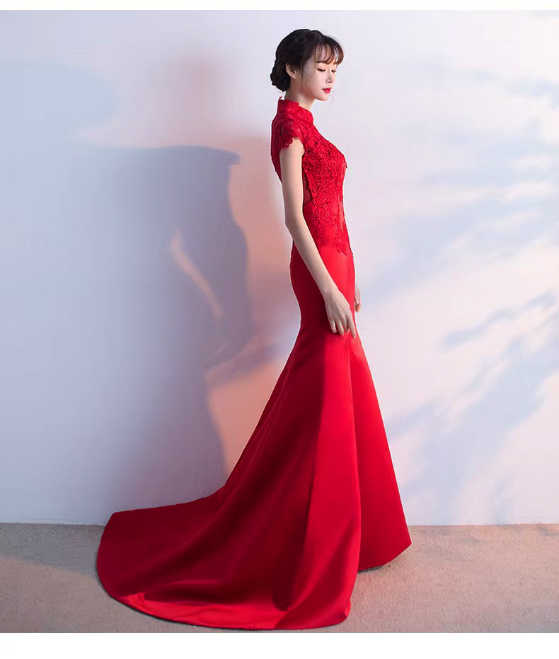 375 red long style wedding dress with train