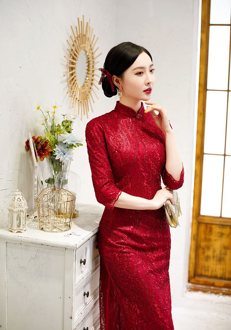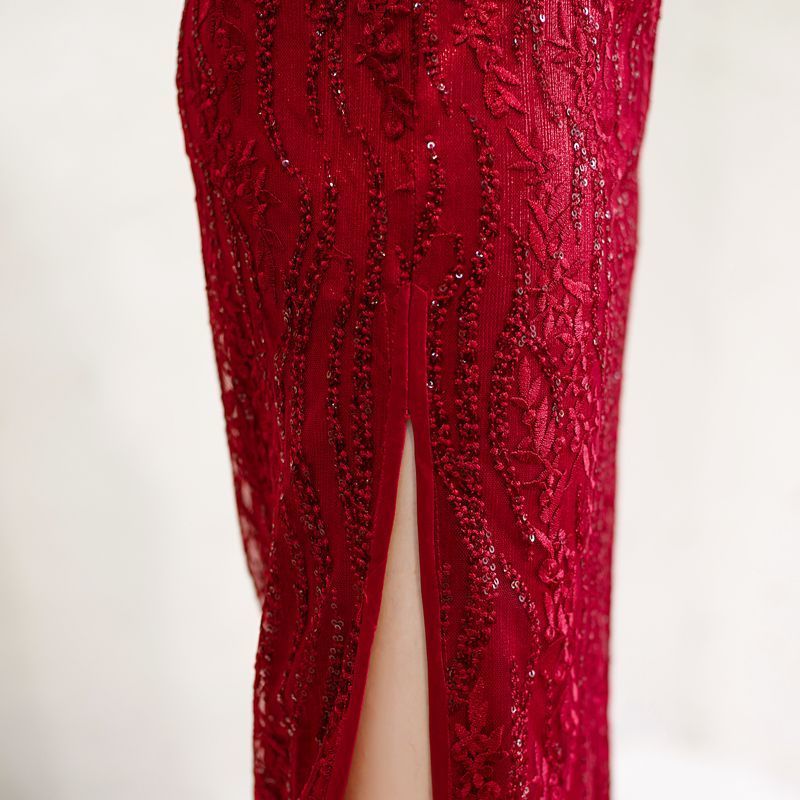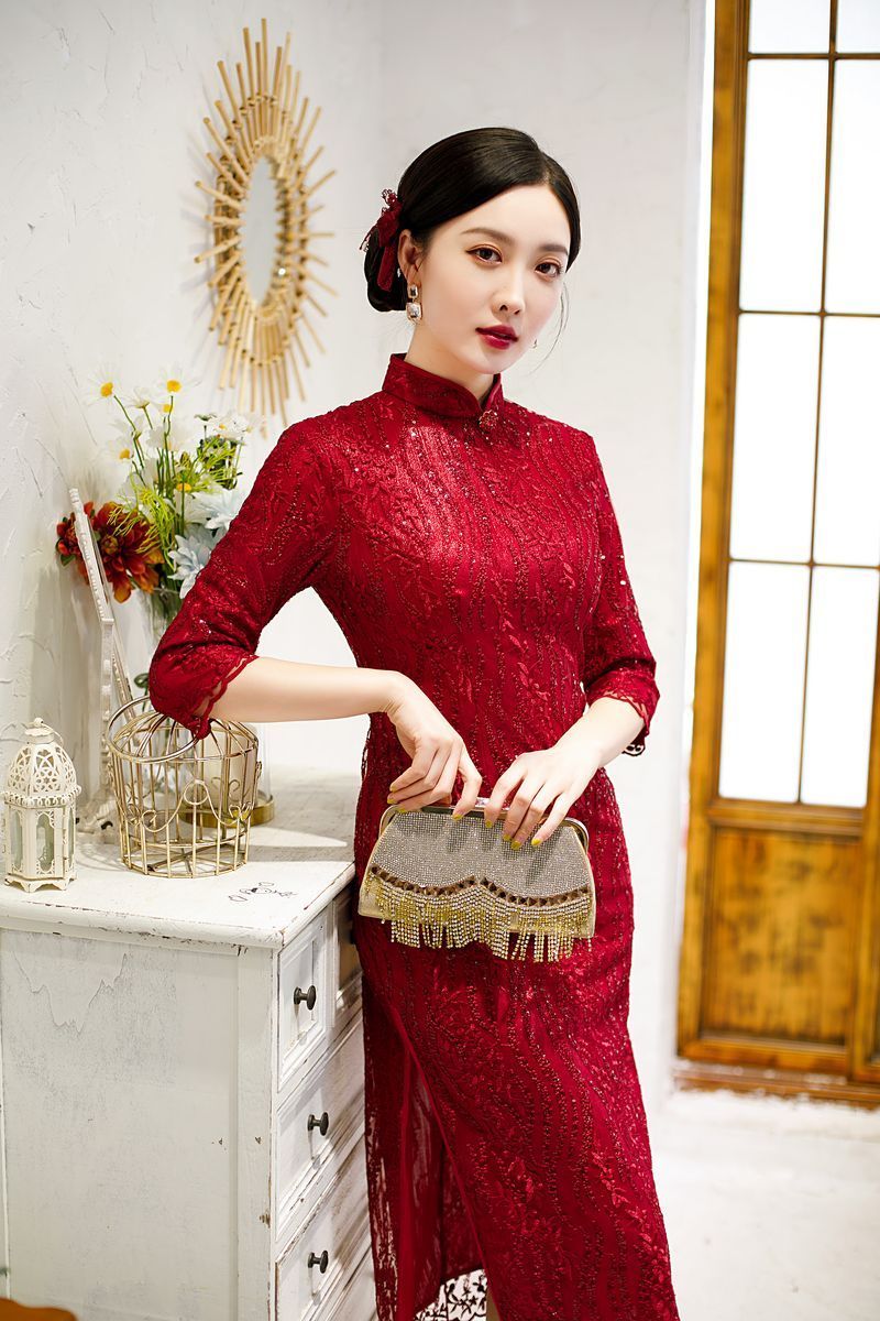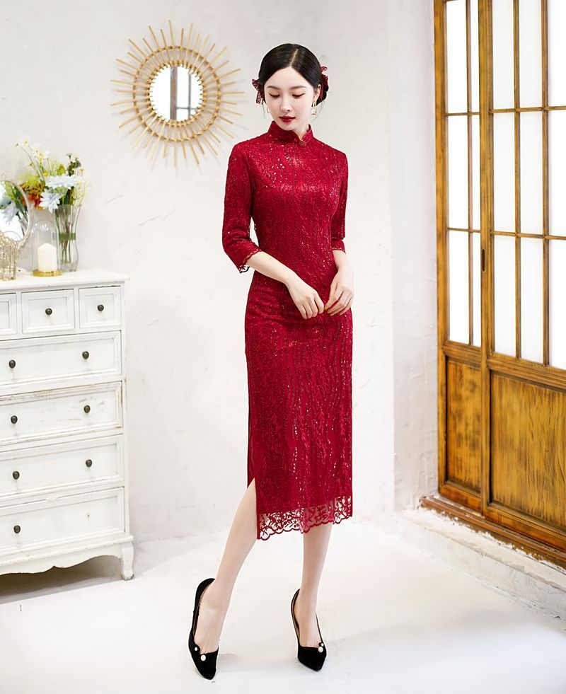 8043 Red Qipao Dress With Sequins